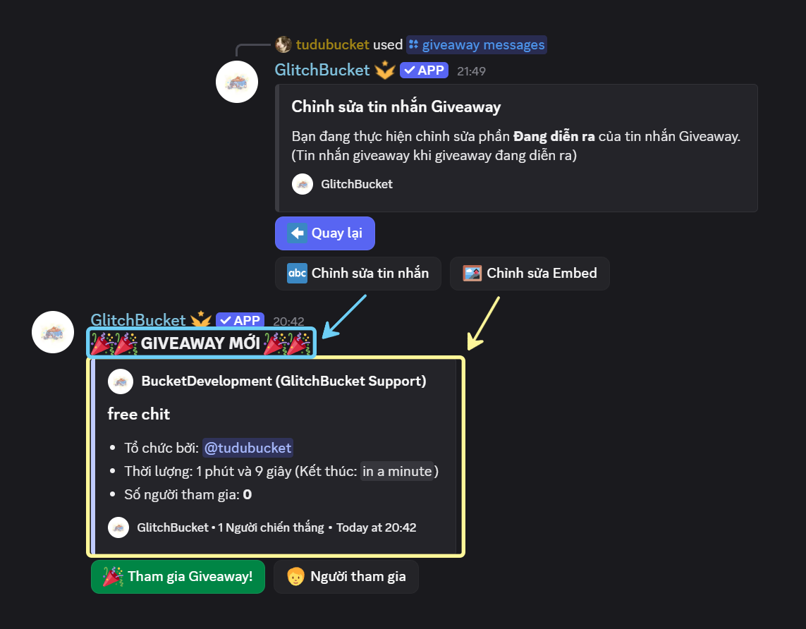 Lệnh này sẽ bắt đầu hỏi các thông tin về giveaway. Một menu sẽ hiện ra và bạn sẽ thực hiện chỉnh sửa trên đó./giveaway setup/giveaway end